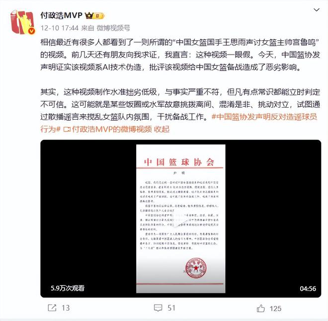 12月10日,中國籃協(xié)發(fā)布官方聲明,明確指出網(wǎng)上流傳的"王思雨控訴宮魯鳴"視頻為AI偽造的虛假信息,造謠者的目的是挑動矛盾、非法牟利。