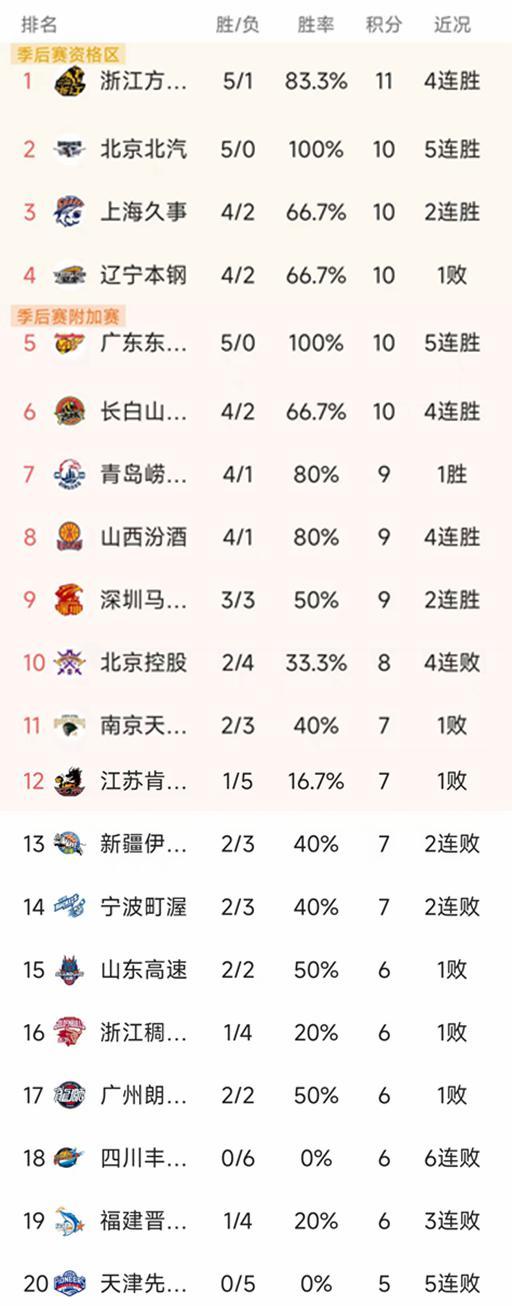CBA常規(guī)賽第6輪結(jié)束了4場比賽,最新積分榜如下!