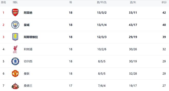 在積分榜上,阿森納以42分高居榜首。曼城緊隨其后,拿到40分。阿斯頓維拉繼續(xù)高歌猛進(jìn),拿到39分,排名第3。利物浦贏球之后,總積分達(dá)到32分,超越切爾西升到第4名。切爾西依然是29分,掉到第5名。而曼聯(lián)也是29分,排名第6。