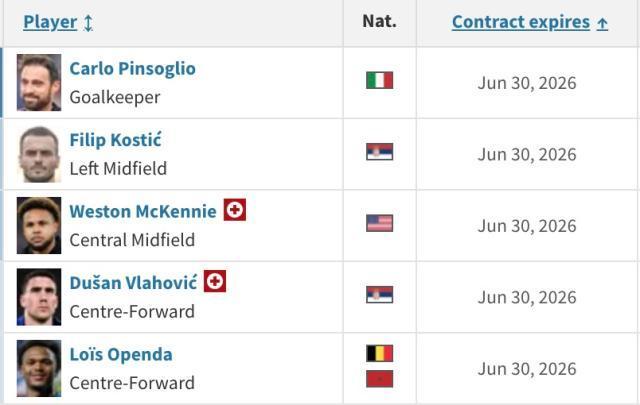 尤文陣中有5名球員合同明夏就將到期。